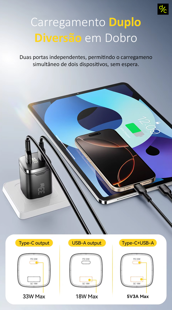 Suporte multi-dispositivos de carregamento: notebook, tablet, celular, smartwatch, fones de ouvido.